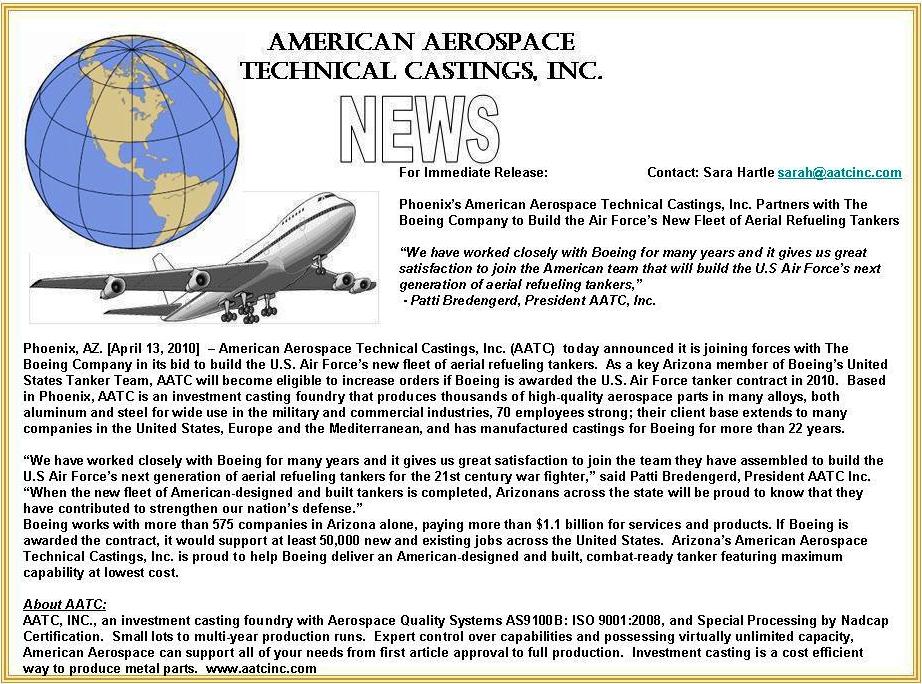 AATC partners with The Boeing Company to build the Air force’s new fleet of Aerial Refueling Tankers. As a key Arizona member of Boeing’s United States Tanker Team, AATC will become eligible to increase orders if Boeing is awarded the U.S. Air Force tanker contract in 2010. Read News Release here.